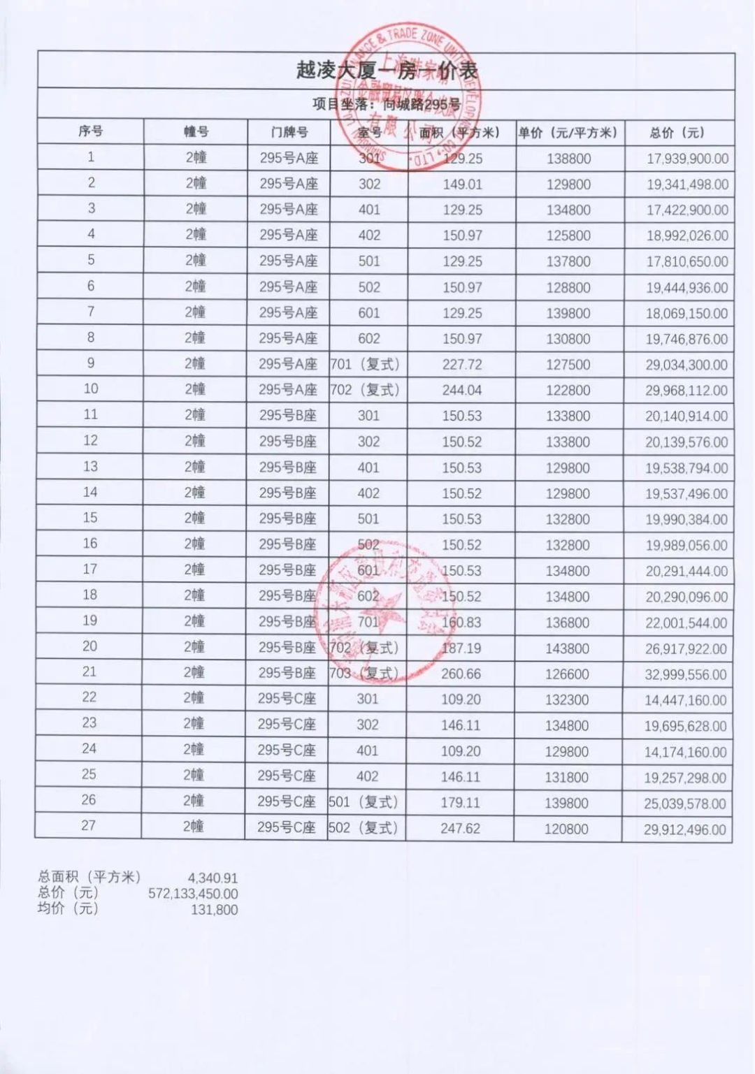 陆家嘴太古源!目前售罄第一批次:2024年12月15日 1.2号楼 50套 均价:16.9万/平米 触发积分 五年限售,世纪臻邸价格才12.5万/平,还有95折优惠+送车位真是在陆家嘴地区打着灯笼也找不到了! 最新一房一价表: