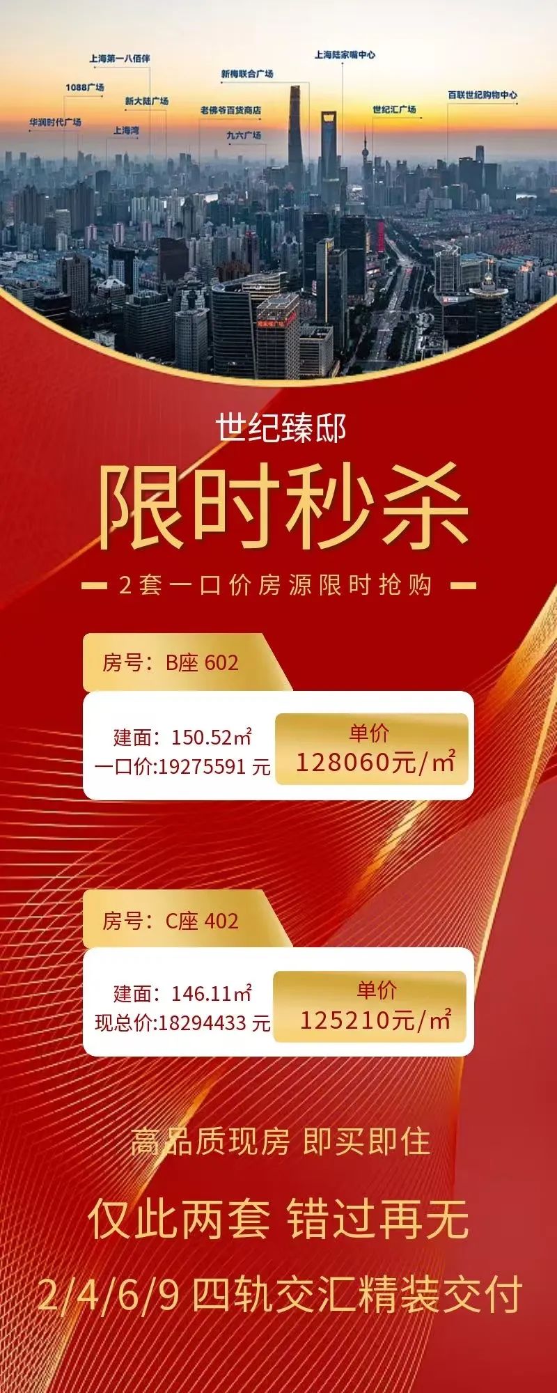 世纪臻邸最新消息,世纪大道站「世纪臻邸」最新户型图发布!建面约109-261㎡3-4房,直接认购!陆家嘴现房+95折+送车位!