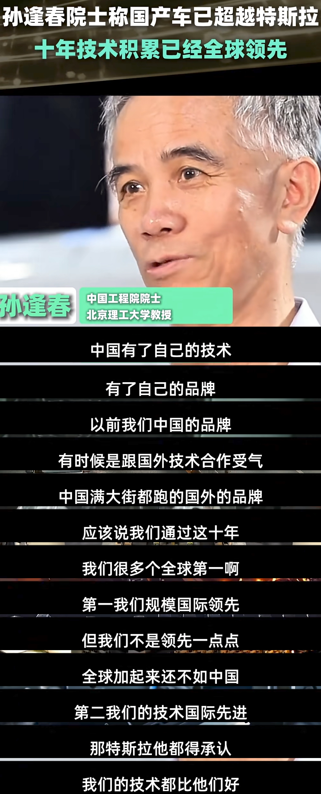 近日,孙逢春院士在一期访谈中谈到,国产车规模全球第一,技术领先,特斯拉都承认中国技术好,这下可不得了,评论区立马沦陷!