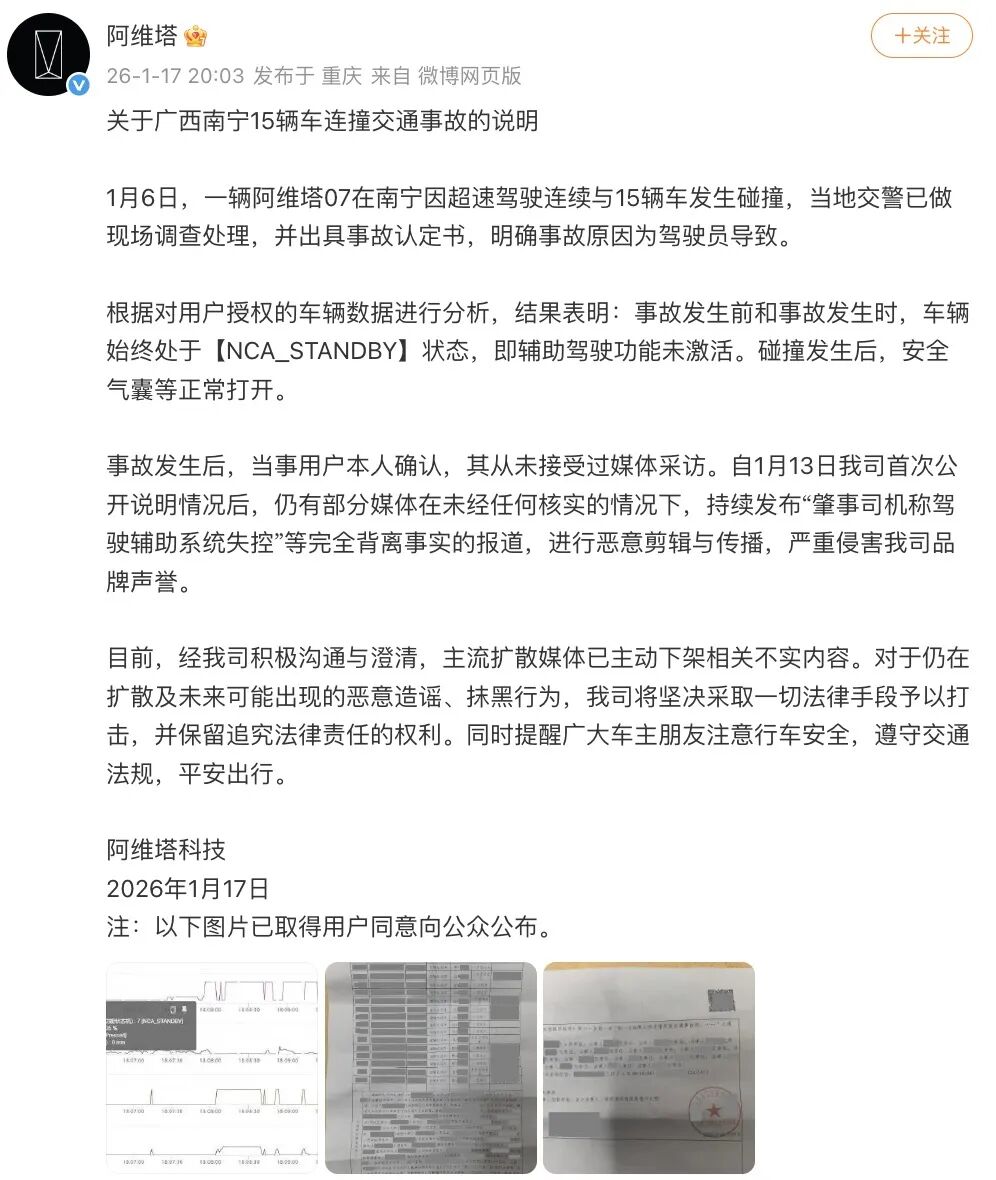 1月17日晚间,阿维塔科技发布了关于广西南宁15辆车连撞交通事故的说明: