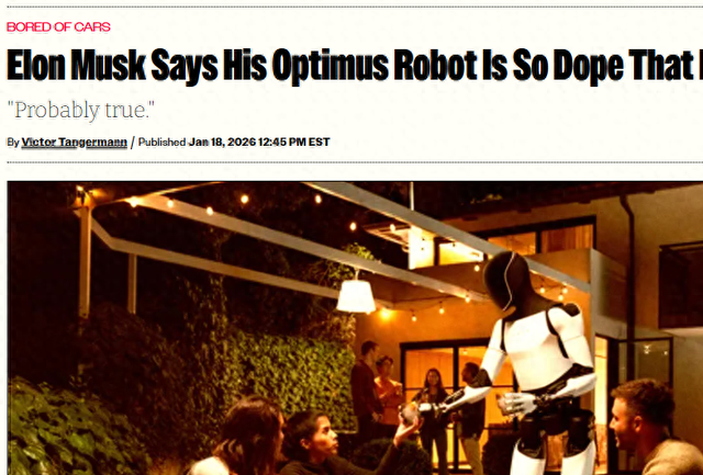 【环球网科技综合报道】1月19日,据外媒Futurism报道,在全球汽车销量持续暴跌、驾驶辅助软件深陷监管困境的双重压力下,特斯拉CEO埃隆·马斯克正急于为公司寻找新出路,而Optimus人形机器人成为其最新执念。马斯克宣称,这款机器人将推动特斯拉转型为估值25万亿美元的机器人公司,其价值占比将远超现有业务。