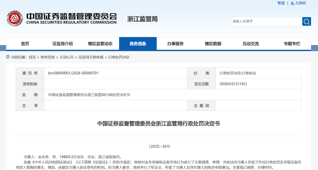 中国证券监督管理委员会浙江监管局行政处罚决定书