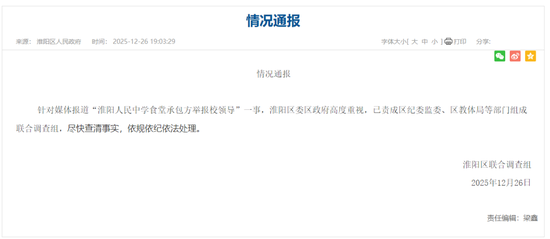 据河南省周口市淮阳区人民政府消息,针对网上反映淮阳人民中学“食堂承包商举报校领导2年拿走300余万现金”问题,周口市淮阳区于2025年12月26日成立联合调查组,开展全面调查核实。现将有关情况通报如下:
