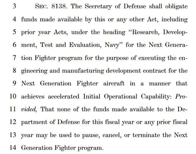 报告还规定,海军部长将在本法案颁布后45天内向国会国防委员会提交一份报告,包括详细说明当前的采购战略和EMD合同的授予时间表、为使F/A-XX项目达到IOC而修订的开发部署时间表、可能导致上年度资金执行延迟的项目预算或者政策障碍,以及该项目拨付给五角大楼的本年度额外资金支出计划。此外该法案草案还明文规定,强制国防部长拨付资金,以“用于加速实现IOC的方式执行下一代战斗机的EMD合同”,并禁止将任何指定拨付给F/A-XX的资金用于“暂停、取消或终止”该项目。