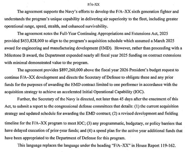 不过 ,在20日早些时候,美国国会参议院拨款委员会公布了2026财年国防拨款法案草案文本,目前正与诸多其他政府机构和部门的支出法案合并审议。与该草案同时发布的还有一份“联合解释性声明报告”,包含更多详细信息和国会方面的指导意见。而此前一天众议院拨款委员会则发布了关于该拟议立法更为简略的信息,简要提到了“加大对F/A-XX战机的投资”。