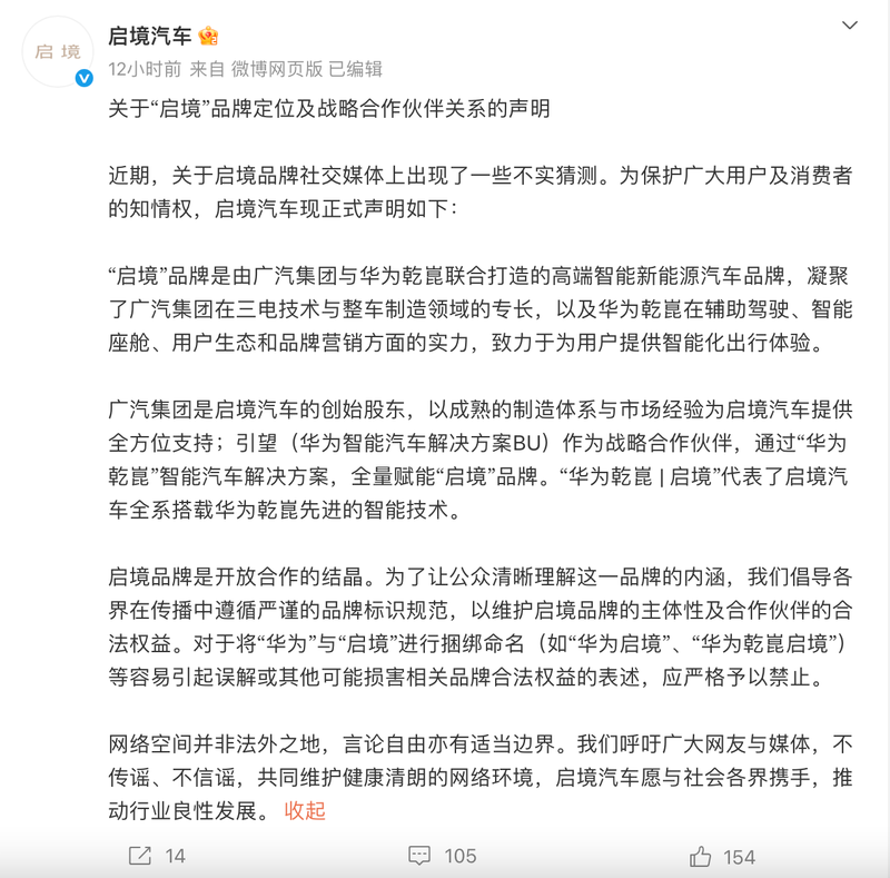 声明指出,启境是广汽集团与华为乾崑联合打造的高端智能新能源汽车品牌,广汽以三电技术与整车制造专长为支撑,华为乾崑则在辅助驾驶、智能座舱等领域全量赋能。广汽作为创始股东提供制造体系与市场经验支持,双方合作标识为“华为乾崑 | 启境”,代表全系车型搭载华为乾崑智能技术。
