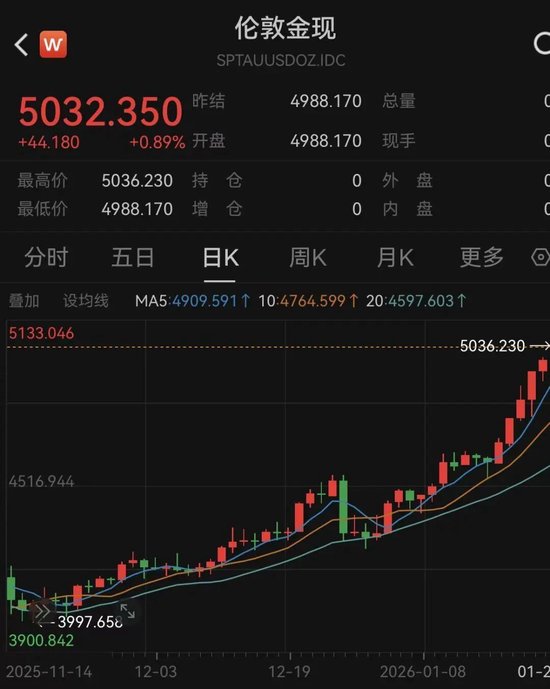 早间,现货黄金直线高开,截至发稿突破5000美元,为史上首次。