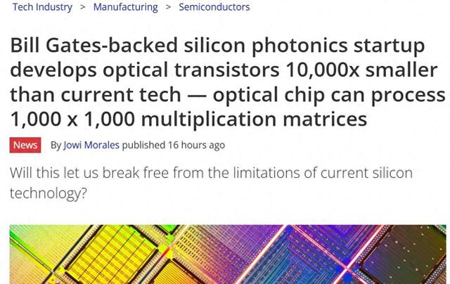 【环球网科技综合报道】1月27日消息,据tomshardware报道称,由比尔·盖茨旗下盖茨前沿基金(Gates Frontier Fund)投资支持的人工智能芯片初创公司Neurophos宣布,其在硅光子学领域取得重大突破。该公司开发的光学处理单元(OPU)采用最小的集成光晶体管,体积较现有技术缩小约10000倍,并首次实现单芯片上1000×1000像素规模的光子计算矩阵。