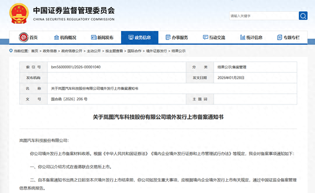【文/观察者网 潘昱辰 编辑/高莘】1月28日,中国证券监督管理委员会发布《关于岚图汽车科技股份有限公司境外发行上市备案通知书》。《通知书》显示,岚图汽车以介绍方式在香港联合交易所上市。