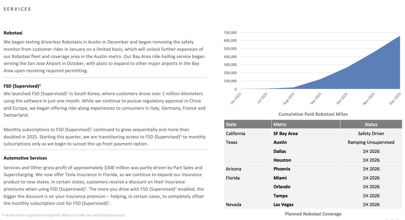 此外,特斯拉也首次在财报中披露了FSD的订阅数据:2025年末,FSD有效订阅用户数达到110万,同比增长38%。据特斯拉官方介绍,其中近70%为一次性购买。目前,特斯拉已在韩国推出有监督版的FSD,并在欧洲多国开展试乘体验。