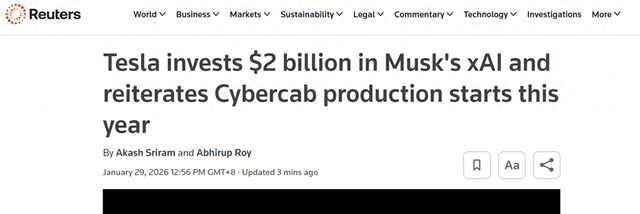 值得关注的是,特斯拉在业绩调整期持续推进战略布局,宣布作为xAI近期一轮融资的重要组成部分,向该AI公司投资约20亿美元,此举将进一步深化其在人工智能领域的布局,为未来技术创新与业务拓展奠定基础。