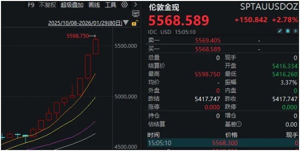 贵金属行情持续走强。今天上午,现货黄金首次突破5500美元/盎司大关;午后,现货白银站上纪录新高120美元/盎司。