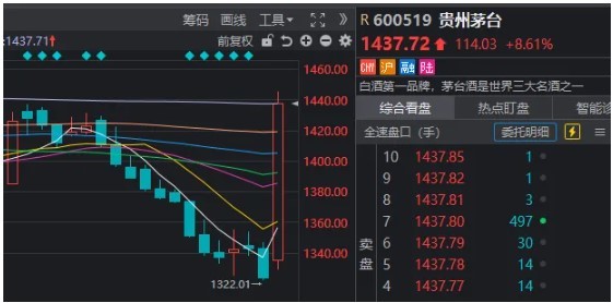 贵州茅台大涨8.61%,全天成交额超263亿元。股价也再度和寒武纪拉开距离,坐稳“股王”宝座。