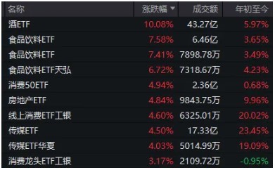 场内ETF中,有酒ETF触及涨停,多只食品饮料ETF、消费ETF也纷纷领涨。