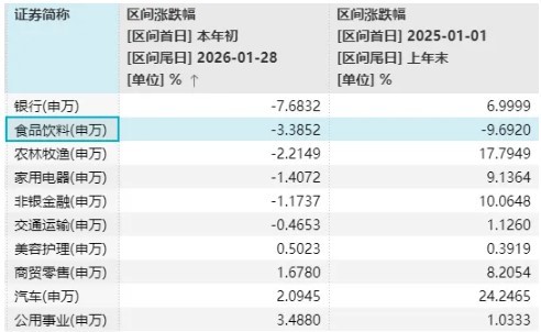 Wind数据显示,在申万一级行业中,食品饮料在2025年以约9.7%的跌幅垫底;2026年以来,截至周三(1月28日)收盘,跌幅(3.38%)也排在第二。