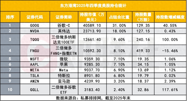 从持仓结构看,截至2025年末,东方港湾的前十大持仓几乎被科技巨头与相关指数产品包圆。谷歌市值约4.06亿美元,权重达到31%,是组合第一大重仓股;英伟达市值约2.37亿美元,权重18%;两只三倍做多产品TQQQ与FNGU,市值分别约1.27亿美元、1.06亿美元,对应9.6%与8.1%的组合比重,四者合计权重约66.7%。