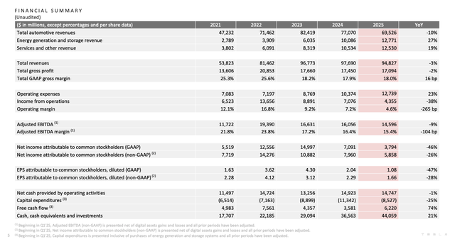 2025年全年,特斯拉的GAAP(公认会计准则)净利润为37.94亿美元(约合人民币263.52亿元),同比下滑46%,接近腰斩,同时也是近5年新低。