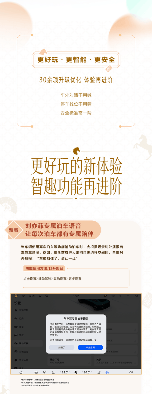 更出圈的当属刘亦菲专属泊车语音包,激活离车泊入后,如果前方行人阻挡无绕行空间,车辆会自动外放来自刘亦菲的提示:“车被挡住了,请让一让。”路人听见的是明星原声,车主收获的是“偶像同款”陪伴,科技由此拥有了情绪温度。