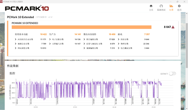 最后是整机性能,使用PCMARK10 EXTENDED模式进行测试,得到总分8047,其中子项常用基本功能10422、生产力14141、数位内容创作10450、游戏7357,从子项得分来看,HP EliteBook X G1i非常适合日常办公以及创作工作。