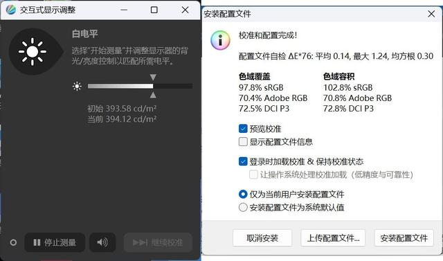 我对屏幕的亮度和色域进行了测试,实测屏幕的最高亮度为394尼特,色域覆盖97.8% sRGB、70.4% Adobe RGB、72.5% DIC P3,色域容积102.8% sRGB、70.8% Adobe RGB、72.8% DIC P3。实测成绩与官方数据基本一致。