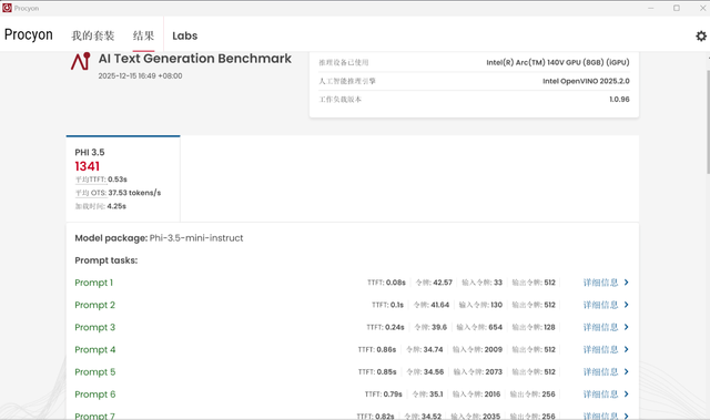 AI性能方面,核显和NPU在这方面的计算优势比较明显。我使用Procyon的AI Text Generation Benchmark测试核显运行本地大模式的速度,在PHI3.5模型下得到1341分,其平均生成速度高达37.53tokens/s,远远超过了人类正常的阅读速度,可见其AI性能之强,完全可以运行本地大模型。