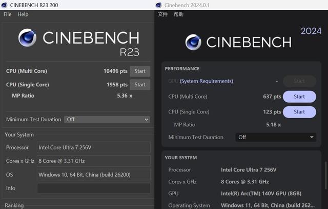 另外,我也使用Cinebench对其理论峰值性能进行了测试,在Cinebench R23中得到多核成绩10496pts、单核成绩1958pts;在Cinebench 2024中得到多核成绩637pts、单核成绩123pts。从结果来看,酷睿Ultra 7 256V的单核性能非常给力,是目前移动平台处理器的高端水平,这主要得益于架构优势;多核性能虽受限于核心规模,并非顶尖水平,但应对日常办公需求完全绰绰有余。