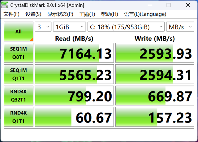 硬盘则采用的是1TB PCIe4.0x4固态硬盘,实测持续读取可达7164.13MB/s,持续写入2593.93MB/s;4K随机性能非常出色,随机读取60.67MB/s,随机写入157.23MB/s。日常使用时更看重4K随机性能,该硬盘表现不俗。