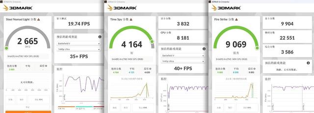 首先是核显的图形性能。使用3DMARK进行测试,在Steel Nomad Light模式下得到2665分;在Time Spy模式下得到总分4164、显卡分3832;在Fire Strike模式下得到总分9069、显卡分9904。实力相当出色,已经快追上近几年游戏本的入门独立显卡了。