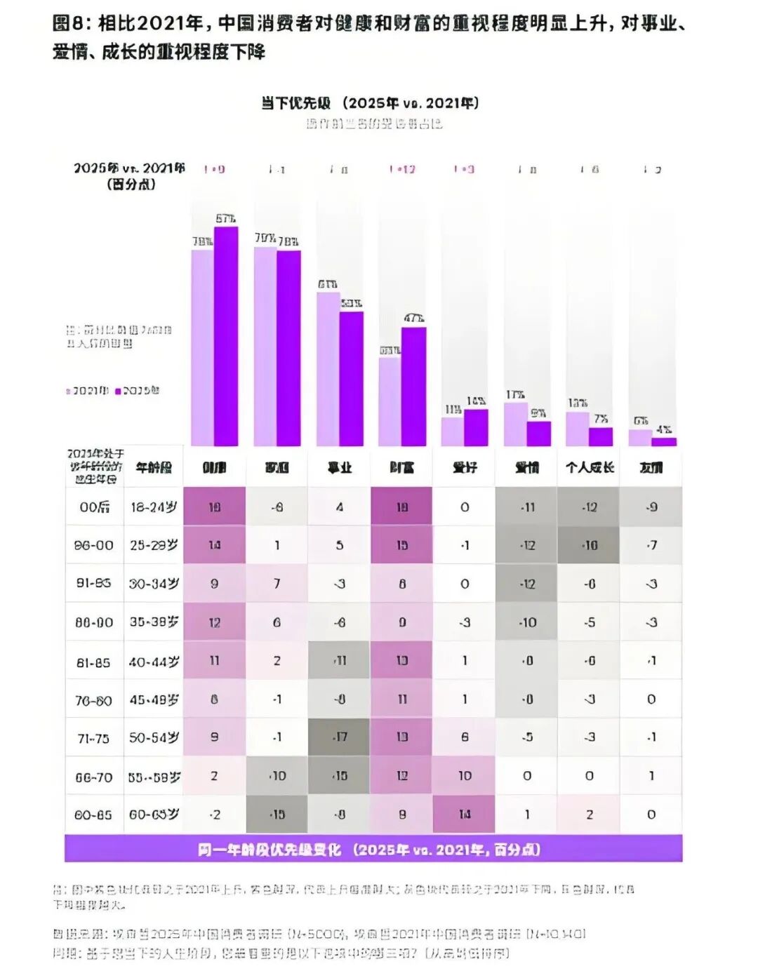 与此同时,中国消费者对“事业”“爱情”等形而上的命题关注度出现回调。在低增长与老龄化社会背景下,大众消费心态从“进攻性增长”转向“防御性保障”,大家更关注如何守住现有的幸福。
