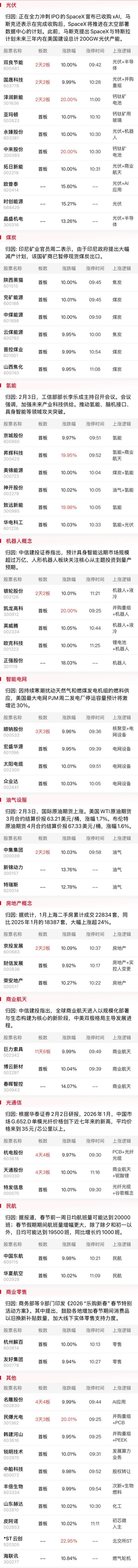 财联社2月4日讯,市场早盘震荡回落,沪指翻绿,创业板指盘中跌超2%。沪深两市半日成交额1.62万亿,较上个交易日放量116亿。盘面上热点快速轮动,全市场超2900只个股下跌。从板块来看,太空光伏概念爆发,中来股份20cm涨停,国晟科技(维权)2连板。煤炭概念集体反弹,兖矿能源、中煤能源、陕西黑猫涨停。机场航运概念走强,中国东航、华夏航空涨停。房地产板块表现活跃,荣安地产、财信发展涨停。氢能源概念快速拉升,京城股份、致远新能涨停。下跌方面,贵金属概念高开低走,招金黄金、四川黄金大跌。AI应用概念集体下挫,引力传媒跌停。截至收盘,深成指跌0.92%,创业板指跌1.74%。