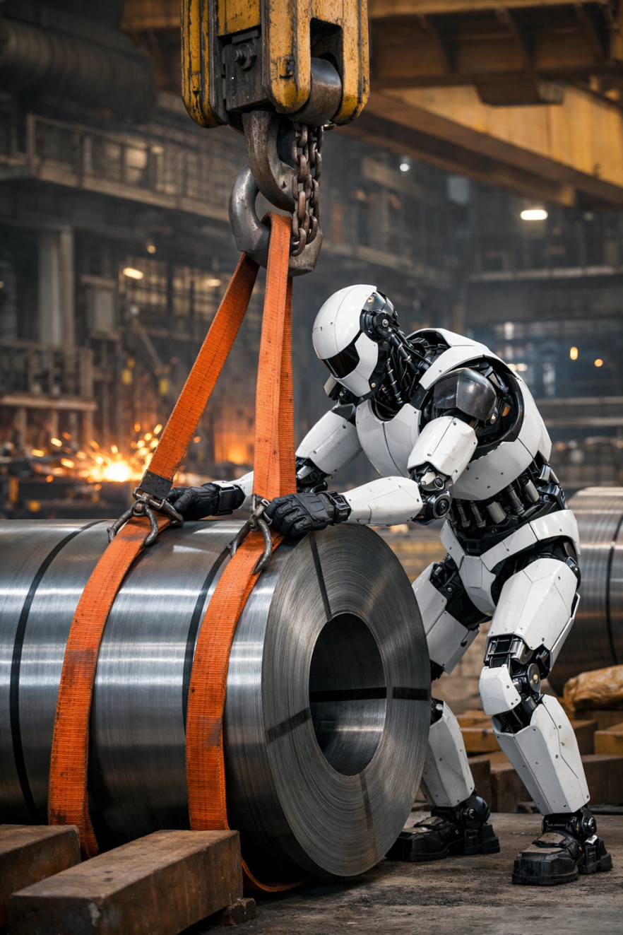 根据公开报道,本次PoC将聚焦钢厂成品钢卷的装卸物流环节。浦项方面计划让人形机器人与现场人员协同作业,在卸载过程中完成将起重机吊装带固定到大型钢制品上的关键动作;相关钢卷单卷重量被披露为20—40吨量级,该环节事故风险较高,也容易造成作业人员肌肉骨骼劳损,导入机器人的核心目标之一就是降低伤害风险并提升作业可持续性。