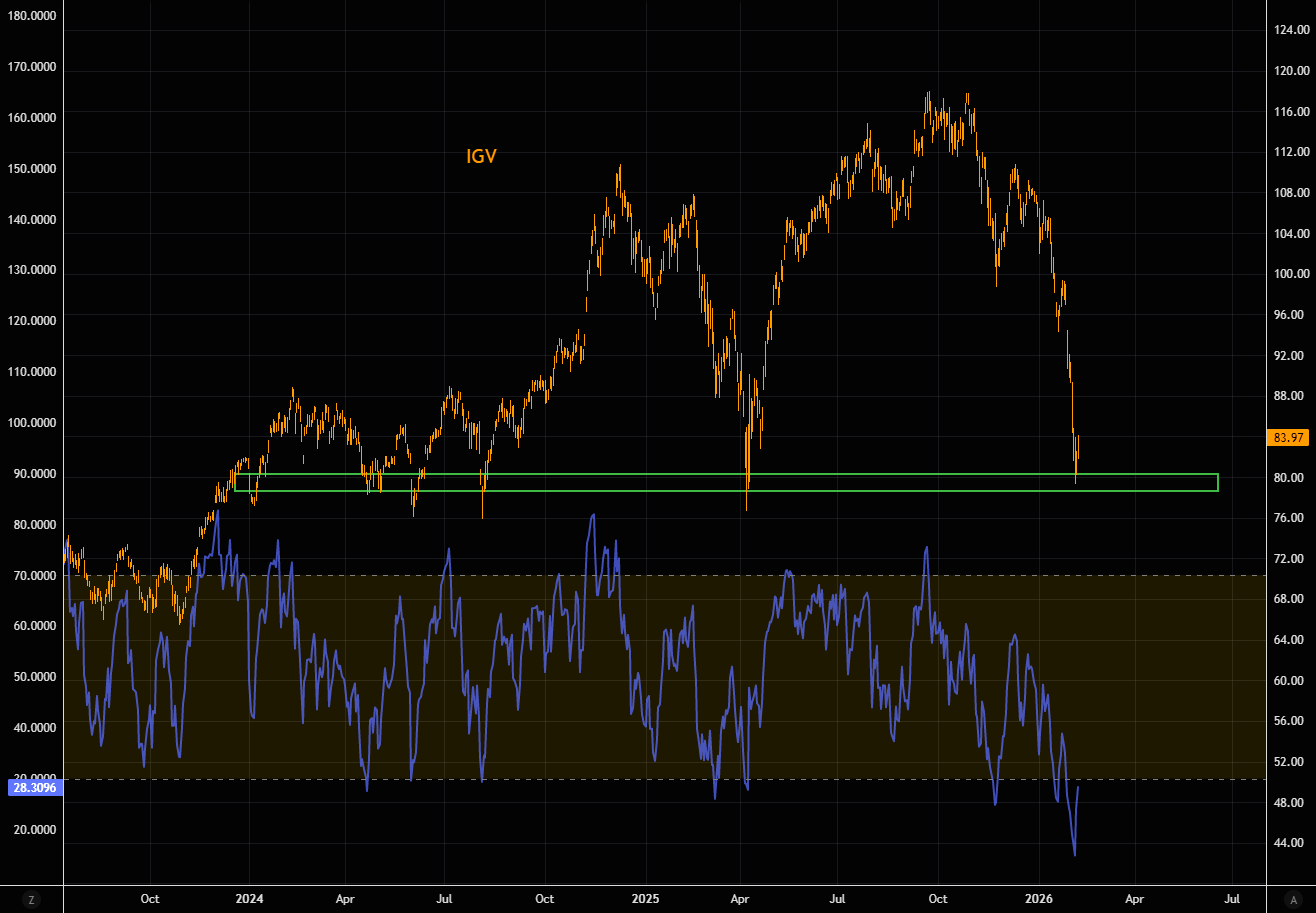 软件板块整体走强,iShares Expanded Tech-Software Sector ETF周一上涨3%,此前该ETF已较高点暴跌约28%,市场担忧AI将接管软件传统职能并颠覆其收入模式。Wedbush Securities分析师Dan Ives称近期软件股"末日"叙事"极度夸张",并将Salesforce和ServiceNow加入该机构AI 30榜单。
