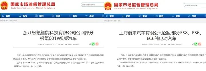 国家市场监督管理总局近日发布多条召回公告,涉及极氪、蔚来、捷豹路虎、福特、沃尔沃五家车企,其中两起召回直指动力电池安全问题。