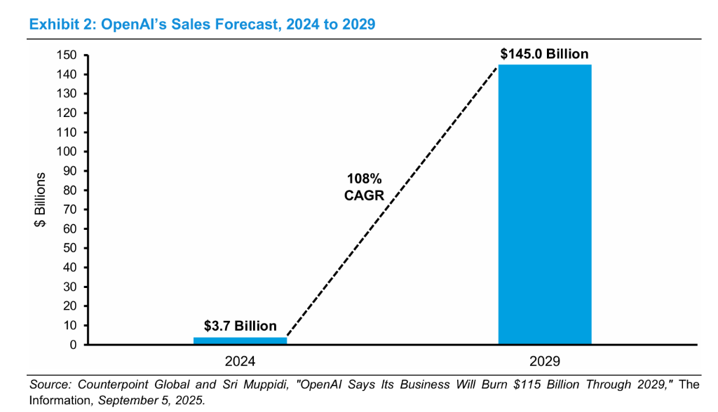 - 短期收入增速:OpenAI预计2025年收入约130亿美元,同比增速约250%。这远高于贯穿五年的平均复合增速。