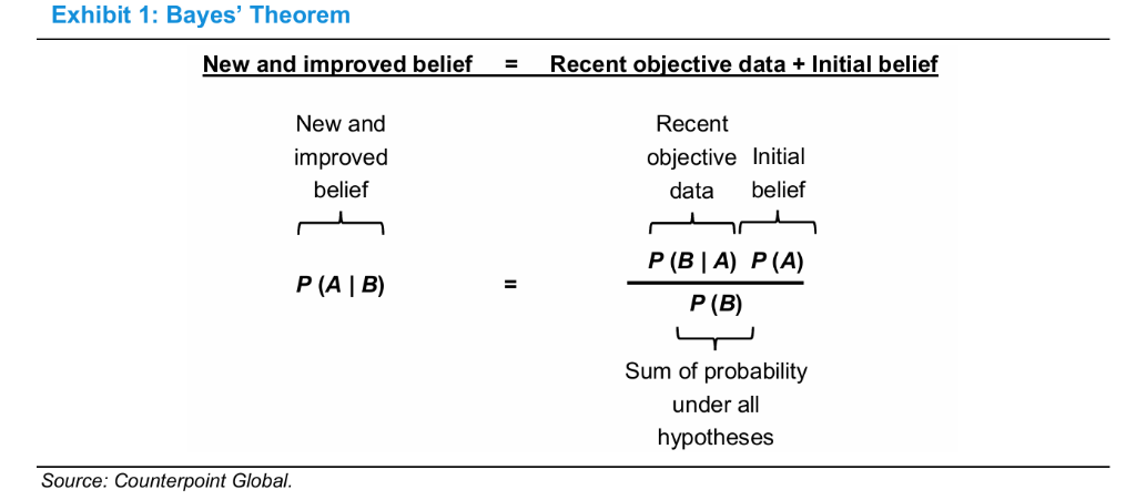 据追风交易台消息,摩根士丹利投资管理旗下Counterpoint Global的Michael J. Mauboussin在10日的报告中直截了当地给出方法论:评估这类前瞻判断,应该“starting with an initial belief and updating that belief as new results appear”,也就是“贝叶斯公式”:“新结论 = 初始判断(先验概率) × 新证据带来的调整系数(似然比)”。