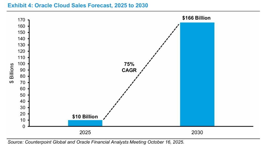 甲骨文的叙事来自另一类证据:公司在2025年宣布了多笔数十亿美元级别的云基础设施合同,显著推高“Remaining Performance Obligations”(已签客户协议对应的未来收入)。管理层据此预测云业务收入从2025财年100亿美元增长到2030财年1660亿美元,对应5年75%复合增速。该云业务在2025财年约占甲骨文总收入574亿美元的17%。