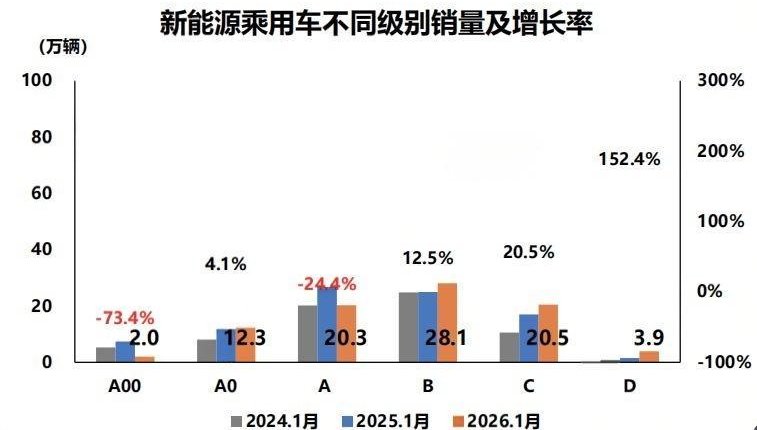 《每日经济新闻》记者查阅发现,1月,新能源乘用车中仅有A00级和A级车的销量出现下滑,其他级别车型销量皆呈现不同幅度的上涨。