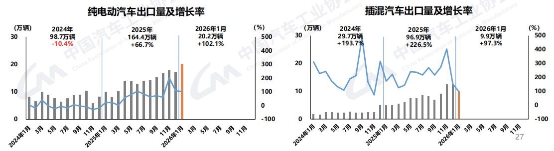 数据显示,2024年,纯电动汽车出口98.7万辆,同比下滑10.4%;插混车出口29.7万辆,同比增长193.7%。2025年,纯电动汽车出口164.4万辆,同比增长66.7%;插混车出口96.9万辆,同比增长226.5%。