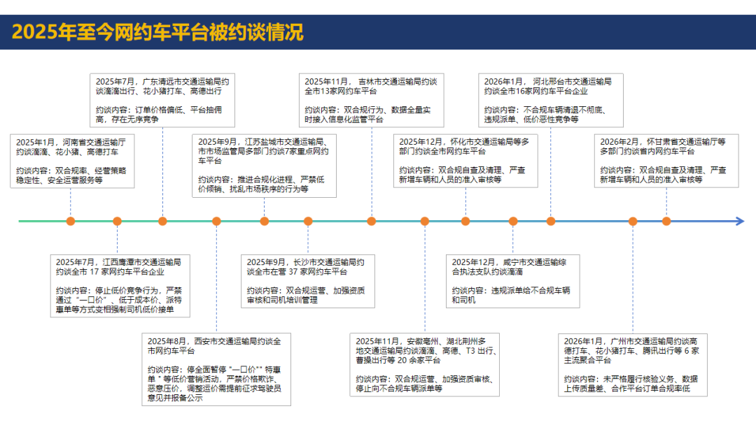 源媒汇初步统计,自2025年以来,多地交通运输部门对重点网约车平台约谈次数为11次。约谈内容几乎一致:双(车辆、司机)资质合规问题、平台资质审核、低价竞争以及合规数据失真。