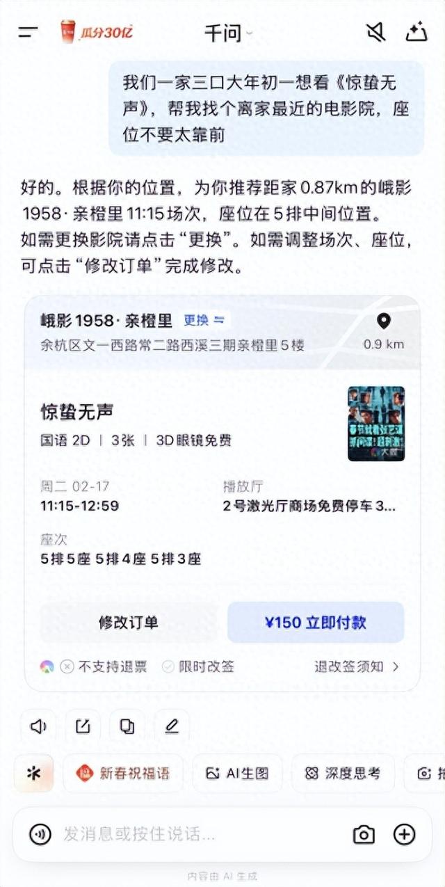 后续千问还将陆续接入AI打车、充手机话费、高德扫街榜团购、淘宝购物等新功能,均可使用超级免单卡,有效期一直到4月30日,过完年还能用。