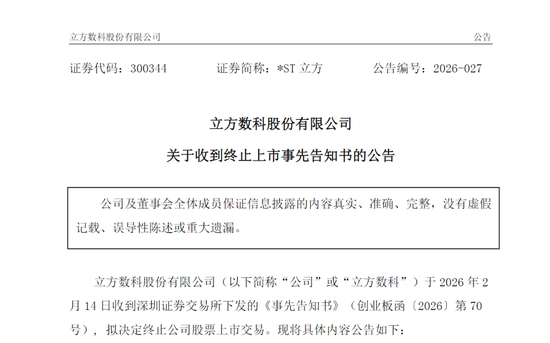 *ST立方2月14日发布关于收到终止上市事先告知书的公告称,根据上述行政处罚决定书载明的事实,公司2021年至2023年年度报告信息披露存在虚假记载,2021年和2022年连续两年存在虚假记载的营业收入金额合计达到5亿元以上,且超过该两年披露的年度营业收入合计金额的50%。