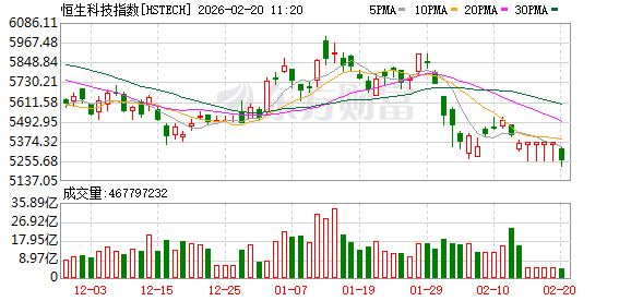 2月20日,港股三大指数早间小幅低开:恒生指数跌0.18%,恒生科技指数跌0.69%,恒生国企指数跌0.19%。随后,港股市场震荡走低,恒生指数跌超1%,恒生科技指数跌幅一度达到2.7%。截至发稿,港股主要指数跌幅有所收窄,但仍是绿多红少。
