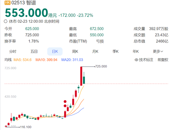 此前在GLM‑5旗舰模型发布与Coding套餐提价30%的催化下,智谱股价持续爆发。2月20日收报725港元,总市值达3232亿港元,按上市首日开盘价计算,累计涨幅超500%,成为港股AI大模型核心标的。