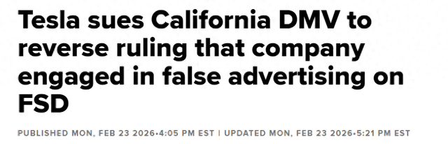 【环球网科技综合报道】2月24日消息,据CNBC报道,特斯拉正起诉美国加利福尼亚州机动车辆管理局,要求其推翻一项裁决,该裁决认定特斯拉因虚假宣传其汽车的自动驾驶功能而违反了法律。