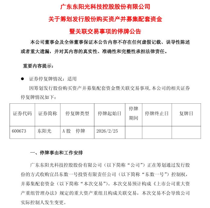 2月24日,东阳光(600673.SH,股价37.80元,市值1137.6亿元)公告称,公司正在筹划通过发行股份的方式收购宜昌东数一号投资有限责任公司(简称“东数一号”)控制权,并募集配套资金。本次交易预计构成重大资产重组且构成关联交易,本次交易不会导致公司实际控制人发生变更。因本次交易尚存在不确定性,公司股票已于2026年2月24日(星期二)开市起停牌,并将于2026年2月25日(星期三)开市起继续停牌,预计停牌(累计)时间不超过10个交易日。