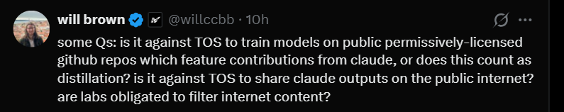 在公开、采用宽松许可协议的 GitHub 仓库上训练模型(这些仓库中包含 Claude 的贡献内容),是否违反服务条款(TOS)?这是否会被视为蒸馏?在公开互联网上分享 Claude 的输出是否违反 TOS?实验室是否有义务对互联网内容进行过滤?使用 Claude Code 编写训练代码,而这些代码被用于训练竞争模型,是否违反 TOS?那么用于构建强化学习(RL)环境中的应用模拟器呢?用于 RL 环境中的用户模拟器提示词呢?评判(judge)提示词呢?合成任务(synthetic tasks)呢?是否有任何清晰的指南?