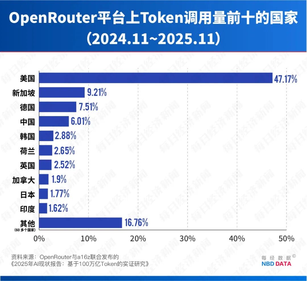 值得注意的是,该平台的用户主要由海外开发者构成,其中美国用户占比高达47.17%,而中国开发者仅占6.01%,这使得其榜单数据更能客观反映中国AI模型在全球范围内的真实吸引力。