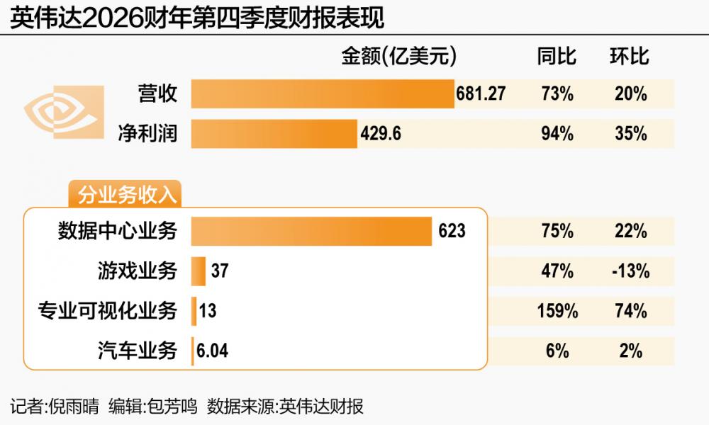 具体到核心业务线,若从2026财年全年看,英伟达的数据中心业务贡献了1934.8亿美元的营收,同比增长68%,是利润支柱。
