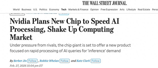 【环球网科技综合报道】2月28日消息,据《华尔街日报》援引知情人士消息,全球芯片巨头英伟达正计划推出一款新型处理器,旨在助力OpenAI等客户构建速度更快、效率更高的AI系统。该处理器将聚焦于AI“推理”计算领域,以优化人工智能模型对用户查询的响应能力。