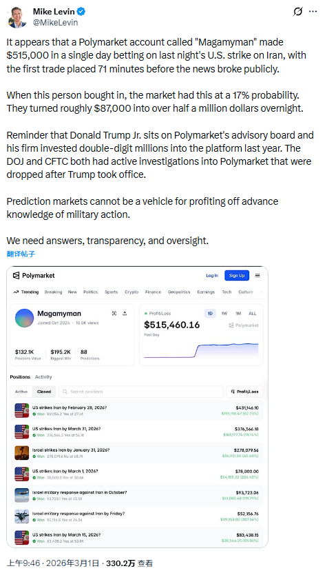 另据MikeLevin在社交平台X上发文披露,上述六个账户中,一个名为“Magamyman”的Polymarket账户单日获利51.5万美元,其首笔交易发生在相关新闻公开披露前71分钟。